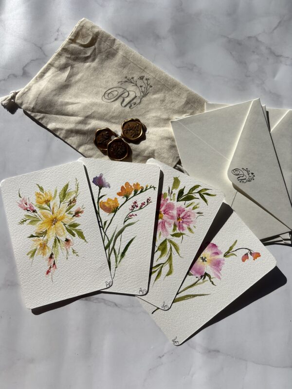 הסט מכיל: 4 כרטיסי ברכה, 4 מעטפות ,4 מדבקות סגירה בהתאם לסוג המעטפה ושקית פשתן למתנה.